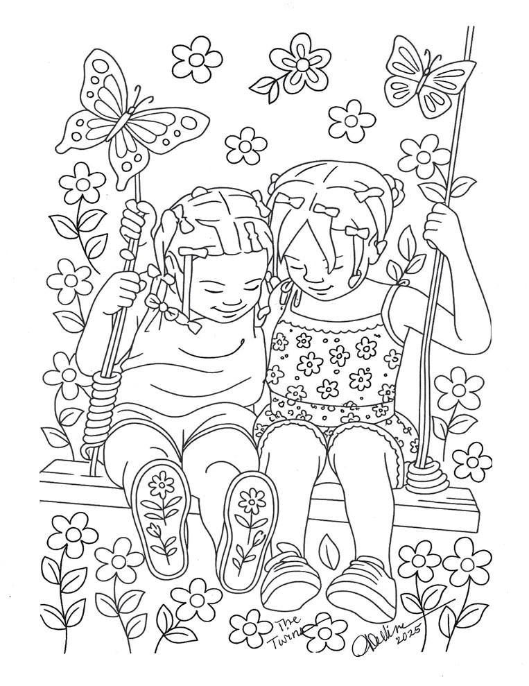 About the coloring pages, “The Twins” is based on a photograph of my twin daughters, when they were around 3 or 4 years old. They were sharing a swing that was suspended from a large tree in the idyllic back yard of a home in Altadena. The other pages are abstract versions of a handmade book I made to highlight Adinkra symbols,